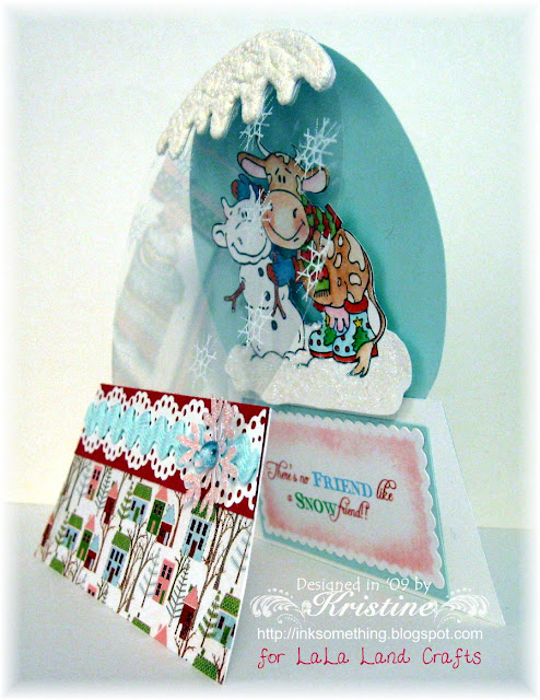 I decided to make a SNOW GLOBE! Well, a card that looks like one anyway! =) This was so fun to make. I saw this tutorial over at SCS. I had to adjust my measurements since this image was too large for the measurements given. (I believe I cut my circle 4.5" in diameter and they called for a 3.75") Aren't these some of the CUTEST winter stamps?!! Here's a sideview so you can see how I did the inside. It says, "There's no friend like a SNOW friend" which I printed from my computer.