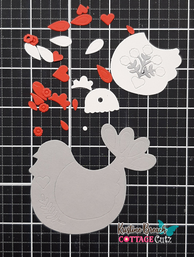 5) I die cut my Hen from light grey, white, and red cardstock (to match the cute chickens on my paper!) and assembled.