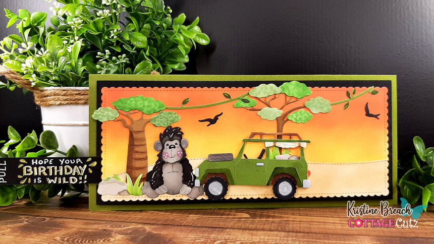 Hi guys! Today's card is a Safari-themed Pull Tab Slimline Slider card (that's a mouthfull! LOL!) This is a fun card for a boy's birthday. My great nephew loves interactive cards (who doesn't?!) For this one I used magnets to help the cruiser slide across, but it can easily be adapted with a slider channel.