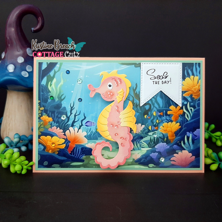 All of my card bases are 4x6" and the mats on the jellyfish and seahorse cards are about 3/16" smaller. The patterned paper is cut 1/8" smaller than the mats. The mat and patterned paper on the Octopus card are cut a bit shorter as that particular paper had 2 design strips on one side, so I cut it apart and mounted it towards the top which left a nice spot at the bottom to add my sentiment strip.